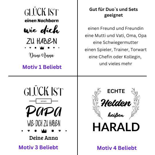 | Bezeichnung | Preis/Stück | Duo Preis | Stück im Set | Setpreis | Breite | Höhe |